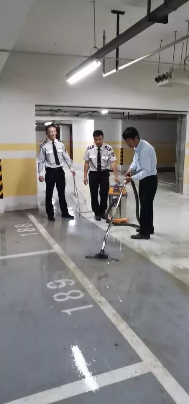 分配完后,大家积极的投入到清扫工作中,有条不紊的开展着工作,由于车库地方大,清洗起来很不方便,但是仁友公司的保洁挥汗如雨,没有一个人喊苦喊累。刘世全主管也加入到清理活动中,工作中不分职位高低,刘主管激情豪迈的挥舞着手中的清洁工具,遇到难清理的污垢蹲下身用小铲子一个一个的清理。在大家近三个小时的齐心努力下,终于把停车场清理的干干净净。地下停车库焕然一新,这让路过的业主们不停的称赞,那些汗流浃背的保洁员们听到表扬,也露出开心的笑容。