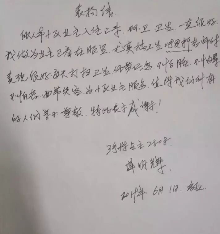 自入公司以来每天兢兢业业,踏踏实实的工作,以高质量、高标准的完成了卫生保洁工作,用她勤劳的双手和辛勤的汗水得到了业主的认可,对此业主们亲笔书写表扬信送到公司,对该同志的崇高敬业精神和热情优质服务提出表扬。