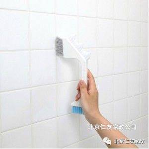 喷洒一定量的清洁剂在瓷砖上,再贴上厨房纸巾.约10分钟后将纸巾撕掉,再用湿布努力擦拭即可.瓷砖缝等较难清洗的地方,可借助旧牙刷刷洗。